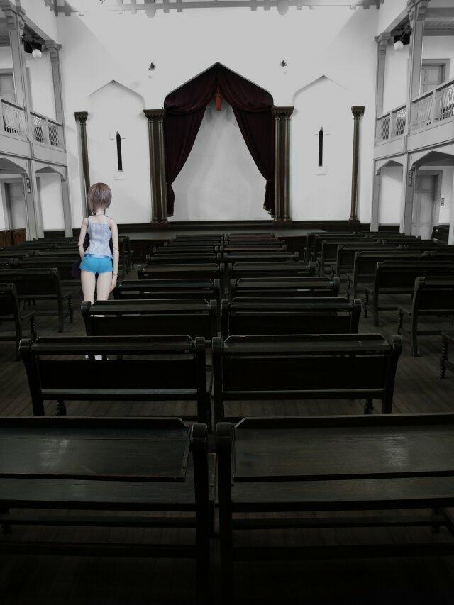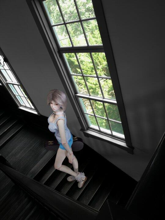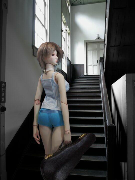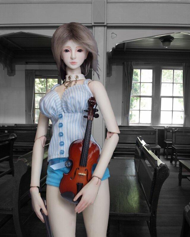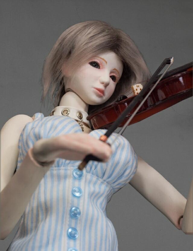 球体関節人形にバイオリンを持たせてポーズをとるのは大変でした。人形のポーズを変えるたびに、天井つり下げた何本もの黒い糸で固定。