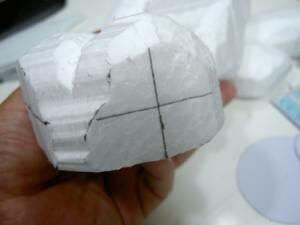 3 つくった型紙を赤線で切り取り、用意した発泡スチロ