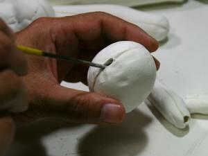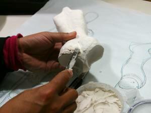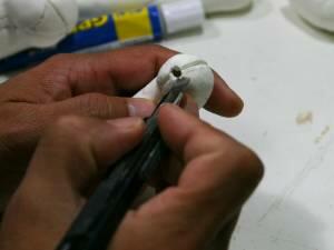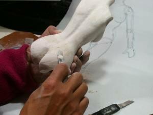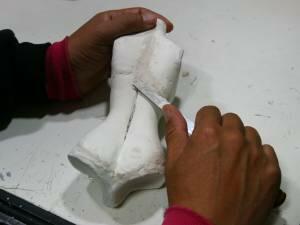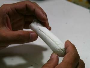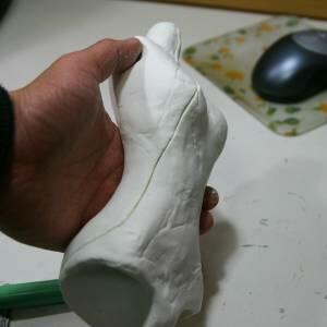 基本的には凹の部分を避けて分割ラインをいれてゆきます。きれいに仕上げるため、このラインと粘土のつなぎ目(上の作業の4)を一致させましょう。