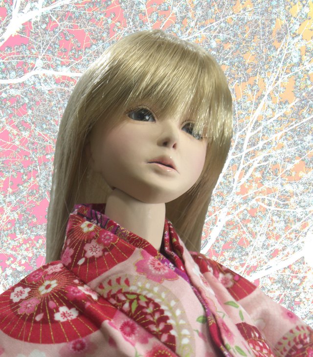 作品はトーンカーブをいじって偽色を発生させた背景に、人形の画像を合成したものです。着付けがうまくゆかなくてすみません。