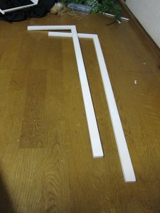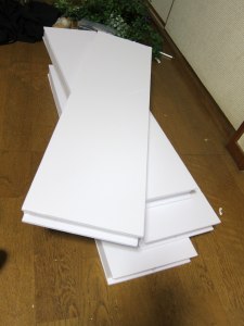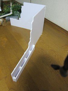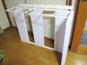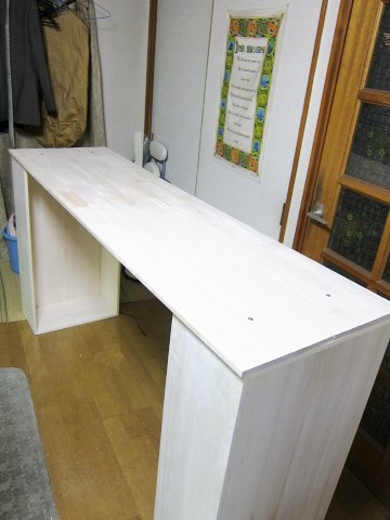 「何つくってるの」の声が・・・。 「人形の展示台・・・。2つの箱をつくって、それを長い板でつなぐのさ。」 「ふーん、カラーボックスと長い板じゃだめなの? もしかして1000円ちょっとの カラーボックスのほうが、簡単・確実で、しかも安くて綺麗で頑丈ってことない?」 「・・・。」