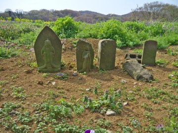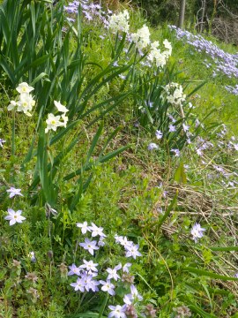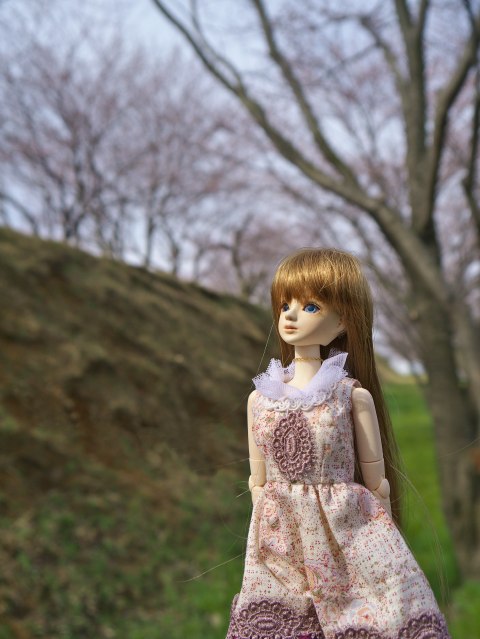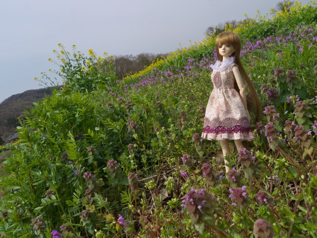 | 桜は少しだけ早かったけど、途中でものすごく素敵な風景 に出会いました。 一面に春の野草の咲いています・・・、すごい。 この瞬間、今回の撮影は人形紹介のコーナーから、旅の コーナーに格上げです。 |