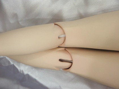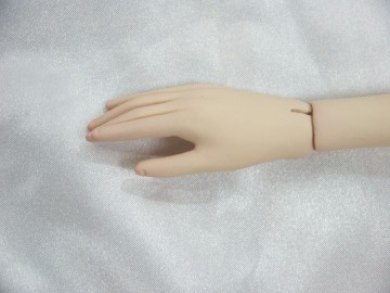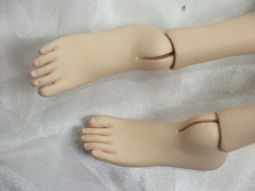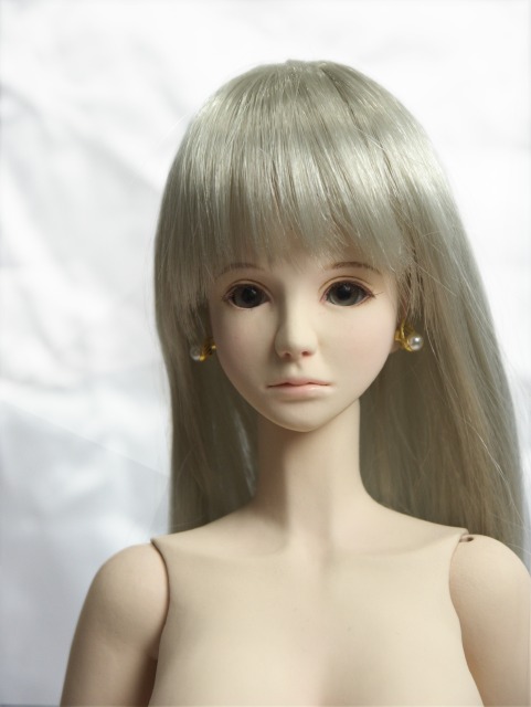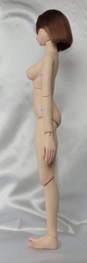 3 市販パーツとの互換性 ● 洋服 1/3スケールの市販品の多くが流用できますがサイズ的に最も近いのはDDU(M)です。データにはありま せんが足の長さのことを考えればDDSのほうが、なお近いと思われます。 また多少大きですがSD用も着用可能です。但しSDの場合、幼児体型に近いイメージでつくられた洋服につ いては、ウエストと下腹部がふっくらしすぎていて似合いません。 ● 靴やブーツ SDからDDUまでのものがひろく利用できます。またつま先をほんの少し上げているので、余裕をもってつく られたものなら、ハイヒールでもSDのものが利用できます。 ● 帽子とウイッグ 表からもお分かりのように、市販のキャスト製ドールに比べるとヘッドはひとまわり小さいです。従って帽子は MSDサイズか、またはそれより小さいものがフィットします。 ウイッグはマジックテープで固定されているだけなので交換が可能です。MSD用のものはややゆるめです。 できれば頭周6〜7インチのものを実際に合わせてみることをおすすめします。 ● ドールアイ 12〜14mmのグラスアイを使用しており、水道管補修用のパテで固定してあります。こちらも交換可能です。 4 品質 粘土製ということもあって、たとえば市販のSDなどのレジンキャスト・ドールと比較したとき、表面の平滑さは やや劣ります。また指先やアイホールといった微細な部分のシャープさにもややかけています。 関節保護のため、ゴムのテンションは低めにしてあります。そのため裸の状態では自立を保つことは難しい です。自立させるにはブーツ等を履かせて足首を固定する必要があります。 肌の質感を出すため、透明度の高いコーティング剤を何度も表面に塗っています。この過程で空気中の埃が 肌の上に固着してしまうことがあります。よく見ないとわかりませんが、除去しきれなかった埃をいくつか確認で きます。