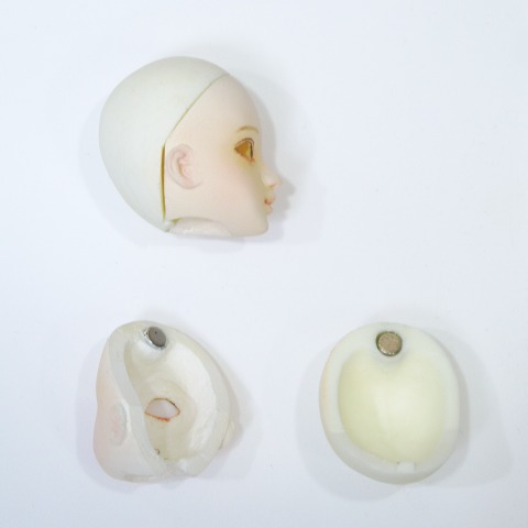 1:6 オリジナルドールヘッド こちらは市販の1:6ボディに組み合わせて使用する、レジンキャスト製オリジナルヘッドの特徴やメンテナンス 方法を解説したページです。現在3種類のドールヘッドを制作していますが、基本的な構造や取り扱いはすべ て同じです。 1 種類 現時点で制作しているのは、画像下の3タイプです。左から順に、 nano obitsu 27cm ボディ (ホワイティ) に合わせてつくりました。 ジョイントを加工することで他のボディにも使用できます。 sayaka obitsu 27cm ボディ (ホワイティ) ほか対応ボディは nano と同じです。 nano に比べると鼻筋がとおっていて少しクールな感じに仕上げてあります。 ikumi Phicen スーパーフレキシブルボディに合わせて作りました。(pale、tan、suntanの3色あり) 旧タイプの Phicen ボディほか、HotStuff、クールガールなどリアルアクション系のボディに似合います。 ![]() nano sayaka ikumi 2 特徴 こちらに掲載している作品は基本的にすべてレジンキャストによって制作されており、首の接合部分の工夫 と、2つのパーツをネオジムマグネットによって接続していることから汎用性が高く、多くのボディに取り付ける ことができます。 また自作ドールアイを組み込み、睫毛をとりつけ、またウイッグを交換式にするなど、このサイズのDOLLとし ては手間のかかる方法で仕上げています。 また基本塗装を終えたあとにウレタンクリアーによる塗装を繰り返しており、高い表面強度を保っています。 基本的な構造は下の画像のとおりです。 ![]() 3 取り付け方法 <オビツボディ> 1 ドール最初についている首ジョイントを外します。 2 付属しているジョイントのうち、大きい方から2つめでヘッドの下部をねじ止めします。 3 ゆるみやがたつきがあったときは、シリコーンのワッシャーをジョイントの下にはさむと良いです。 ![]() <phicen スーパーフレキシブルボディ> 1 最初についているヘッドを首ジョイントから抜きます。 2 ヘッドの下部を金属製ジョイントに差し込みます。 3 付属するシリコーンのワッシャーを金属ジョイントの遊び部分に差し込んですき間をうめます。 *) 2012ごろまでの製品はそのまま装着できますが、2013以降の製品は下部パーツの切削が必要になります。 ![]() 4 メンテナンス ● レジンキャストヘッドにMr.Colorで基本となる塗装を施し、ウレタン塗料のつや消しクリアーで処理した後に Mr.Color等でメイクしています。強くこすったりすると塗装やメイクがはがれ落ちる可能性があります。 ● 紫外線による黄変にご注意下さい。 ● 汚れなどがついてしまった場合には中性洗剤やOAクリーナーを使用して、テッシュなどで軽くふき取ります。 ひどい汚れはメラミンスポンジなどで軽くこすりとることになりますが、表面のクリアー塗装も落ちて光沢が出て きてしまいます。この場合、市販のつや消しクリアーを軽く吹き付けて下さい。 (可能であればつや消しウレタンクリアーでの再塗装がベストです。この際、ドールアイや爪のマスキングをお忘 れなく) ● ご自分で修復が不可能な状態になってしまったらメールにてご相談下さい。できる限り対応させていただきます。 5 市販パーツとの互換性 ● 洋服 本来、組み合わせる obitsu もしくは Phicen ボディの問題なので、こちらからお答えするのはやや筋が違う のですが、ご質問が多いので簡単に整理しておきます。 <オビツボディ> obitsu 27cm ボディは1:6 スケールドールとしては高い汎用性があり、基本的に momoko やJenny 用のOF の多くは着せることができます。またヤフオクなどでもこういったOFを制作されている方は多く、かなりの自由度 で着せ替えを楽しむことができます。 実際、当工房で利用させていただいているOFの大半もこういった市販品やヤフオク出品された作品です。但し 注意すべき点が2つあります。 (1) obitsu 27cm のL胸ボディに着せられるOFは数少ないです。ヘッドに組み合わせるボディはM胸を選ん でおくのが無難です。 (2) obitsu と他のボディを比較したとき、いちばん違うのは太股です。obitsu ボディの太股はボリュームが あり、特に momoko 用につくられたタイトなパンツスタイルは入らないことがあります。 <phicen ボディ> いわゆるリアルアクション系ボディは、自分の記憶によればタカラのクールガールがその先鞭をつけたものと 考えています。基本的にはクールガールのサイズや機能が現在まで引き継がれているものと思っています。現在 販売されているこの系統のボディは Phicenほか、HotStuff、ZC、TRIADTOYS といった香港、中国といった海外 メーカーです。従ってこれらのシリーズのOFも大半が輸入品で、またヤフオクで制作されている方も少ないです。 そのため結果として入手しづらく、また高価になってしまう傾向にあります。 ![]() ● ウイッグ 頭部の周囲は9.5cm程度です。付属のウイッグは両面テープで固定されているだけなので、簡単に交換できま す。頭周3.5〜4.0インチのものが合います。 ● ドールアイ 付属のドールアイは直径7m