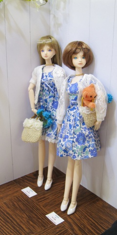 | まずはオリジナルドールの karen と miu です。 今回の出展にあわせて顔や膝下、指先などを修正し ています。 お洋服は例によって JET RUNNER;製です。こちらも 今回のために、みけ様に製作していただきました。 上品な感じにまとまりました。 |