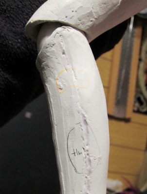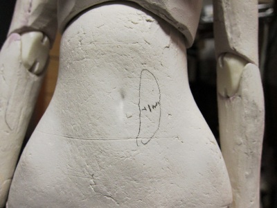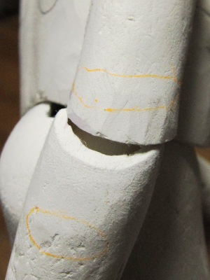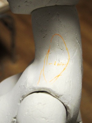 関節の調整が終わったら、まずは全体をながめ、ボディラインをどうする か構想を練ります。 今回は完成度の高くなった原型のポテンシャルを確認するため、全体の メリハリをつけることを目的に調整、造形をすすめます。 なお基本的に関節部分をこれ以上いじることはしません。もしいじると、す べてのバランスが崩れる可能性があるからです。 自分の場合には軽量化のため、粘土は極力薄くして仕上げることにして います。従って削りによる修正には限界があり、おもに粘土の盛りで対応す ることになります。 また盛りによる修正になることを前提に、型どりしたパーツはやや細めに なるよう原型を調整しています。 ということで、今回の調整は、粘土を盛ることによる筋肉や骨格の強調が 中心となります。 4 鉛筆で粘土を盛る部分(黒)と削る部分(オレンジ)でチェックを入れ ます。