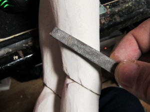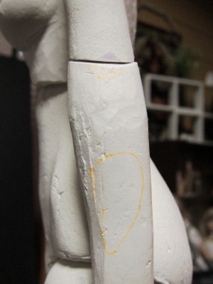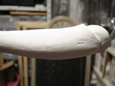 ホワイトサーフェーサーは黄変対策のためと、次のジェッソの塗膜が剥がれ にくくする働きがあります。ただ後で出てくるウレタンクリアーとの相性が悪く、 キズの確認が終わったら、すべて磨いて落としてしまっても良いかなとも思い ます。 ここは今後の検討課題です。 ![]() 次は粘土でできたボディの方です。細かなキズや表面の毛羽立ちなどが まだ残っています。 ![]() 表面の仕上げに入る前に、細かな部分の修正を行います。粘土は 微細な造形に向かないので、瞬間接着パテを用います。