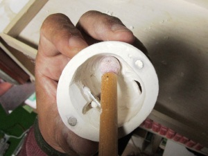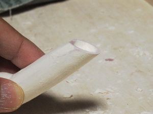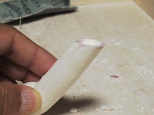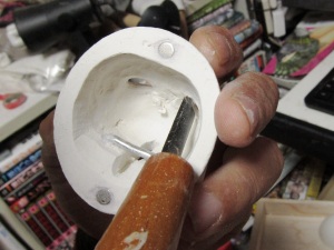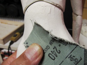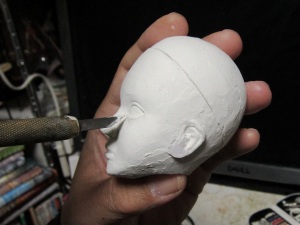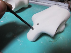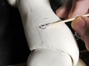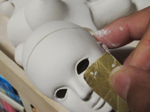の塗布。この単純な作業を幾度となく繰り返すことで、DOLLの肌はど んどんきれいになってゆきます。 根気の必要な作業ですが、完成度の高さに直結する作業なのでが んばります。 ちなみにヤスリの番手は400番に落としました。番手を落とすことで 毛羽立ちは小さくなります。 頃合いを見てアイホールを開けます。イージースリップのおかげで 粘土が固まり、一連の作業はやりやすくなっているはずです。