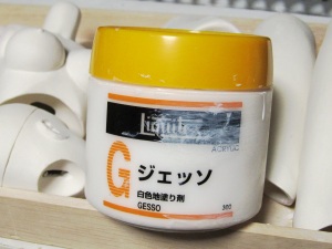このままだと粘土パーツとレジンパーツの質感が異なっており、 また瞬間接着パテの露出している部分もあって、このままでは塗 装にふさわしい下地になっていません。 そこで白色の統一した下地をつくるためにジェッソを塗ってゆき ます。