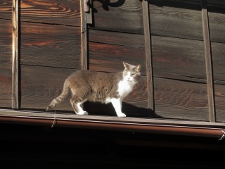 | 9:25 住宅街の奥まっているところでネコ発見。 屋根を歩いてゆくので、それを追っていったら、 彫刻家、平櫛田中の旧家に入ってしまいました。 |