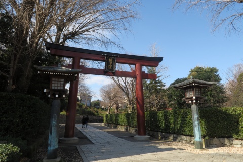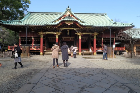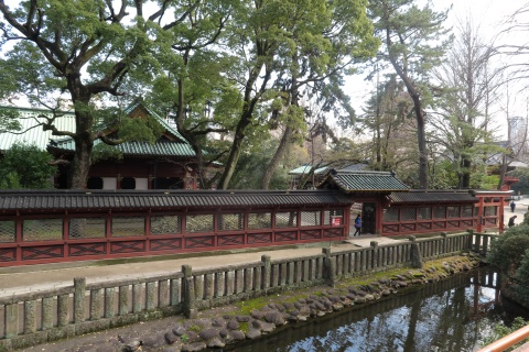| 11:20 こちらは根津神社。現在の社殿は1706年に建て られたもの。本殿のほか、拝殿、幣殿、唐門、楼門、 透塀が国の重要文化財に指定されているそうです。 ちなみに楼門脇の小さな池にカワセミが住んでい るらしく、この日も大きなレンズをつけたカメラを持ち 込んでいる人がいました。 |