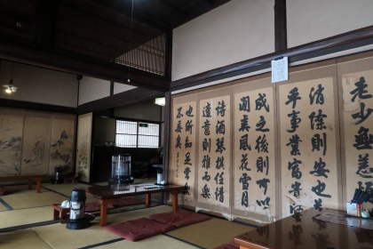 | 太い柱と梁、5mも横に連なる神棚、たくさんの書と ふすま絵・・・。 聞けばこの家はこの地に建てられてから、もう400 年も経っているんだそうです。 すごいね。 |