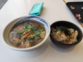 | 時間がかかりすぎて、お腹が空きました。 海ほたるで朝食です。 アサリ蕎麦とアサリご飯のセット1100円なり。朝から ちょっと豪勢ですが、おいしいです。 |