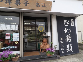 | 古い町には必ずある伝統的和菓子屋さん。 こちら高山製菓は自家製のビワジャムを利用して いろいろなお菓子をつくっています。 ビワジャムと餡をブレンドして、あっさりとしたクリー ムをつくっているのがポイントかな。 入口のウサギの木彫が可愛いです。 |