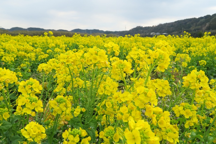 | 9:50 最初の目的地がここ、花に囲まれた道の駅「とみう ら」です。 すでに桜は咲き始め、菜の花は今が満開。 一足早い春を求めて訪れる人は多いです。 背景が青空だと良かったのですが、この日はちょっ と雲が多かったです。それでもばしばしと撮影開始。 |