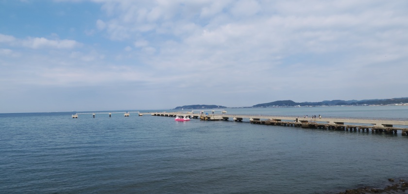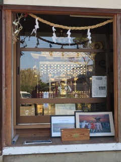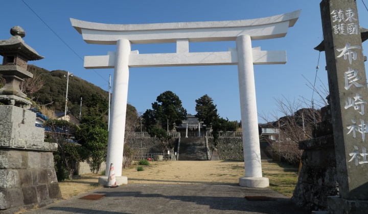 | 14:30 新鮮な魚介類を扱う施設を探しているうちに、とて も古い神社を発見しました。 こちら布良崎神社は717年建立。 天気が良いときには神社、山門から正面に富士が 望めるという、隠れた絶景ポイントです。 (やっぱり今日はちょっと霞んでいた。) |