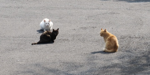 | 防空壕から出てみたらネコが集会してました。 仲の良い3匹みたいです。 さてこれで館山見物は終了。 ここからは房総の先端を巡るフラワーラインをドラ イブします。 幸い天気も良くなってきました。 まずは西へ、平らな広い岩のある西岬海水浴場 付近です。本日これまででいちばんの景色です。 |