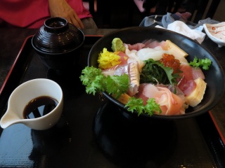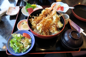 | 13:00 海岸沿いに食堂が一軒ありました。お腹が空いた のでこちらで昼食にします。 連れは地元の海の幸いっぱいの「めめ幸丼」、 (1260円)。自分は天重御膳(1680円)。 ちなみにここに入って大正解。こんなにおいしい 天丼は久しぶりです。リュームも文句なし。 ここ「礒の香亭」は民宿なので泊まることもできま す。今度機会があればぜひって感じです。 |