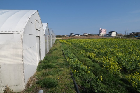 | 14:50 菜の花畑のなかにある道の駅、「白浜野島崎」 直売所では切り花や野菜を手に入れることがで きます。 もちろんここでは菜の花を買いました。 |