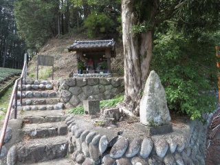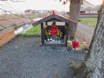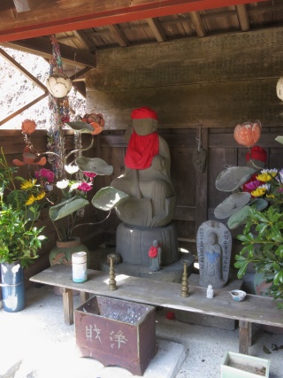 | 13:15 東名高速を藤枝・岡部ICで降り、朝比奈という昔 からある山間の地区を目指しました。 こちらはその地区の入り口にある小園の延命地 蔵尊。説明書によれば駿河の国百地蔵の18番札 所だそうです。 |