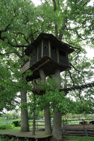 | ツリーハウスに登ってみました。風が心地よいです。 この牧場ができて120年、もちろんここに育つ木々は それ以上の樹齢があるわけで、だからこんな遊びもで きるんですね。 |