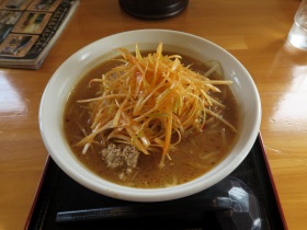 | 11:40 国道118号線沿いに飲食店はほとんどないのです が、ここ角田製麺は有名店なのか、何台もの車が止 まっていましちた。 自分たちはネギラーメンとタンタン麺を注文、納得 の味でした。ちなみに出された水が本当に美味しか ったです。 |