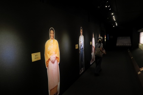 | ここは記念撮影のスペース。小松姫と真田信之といっ しょに写ることができます。 鎧や甲も用意されていますが、お人形さんにはサイ ズ的に無理。 |