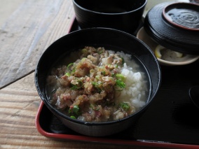 | 11:00 内浦漁協直営の「いけすや」。 とれたての鰺料理が食べられるというので、ここで 昼食にします。 とても人気があるらしく、オープン時刻前なのにもう 20組も待ってました。 まご茶定食+アジフライ1枚をオーダーします。鮮度 は抜群、とっても美味しかったです。 |