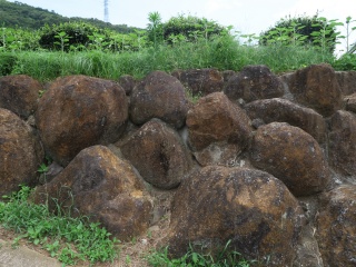 | ところで、この展望台のあるお茶畑は段々畑の形に なっているのですが、その側面はどう考えても簡単に 動かせないような巨大な石を積み重ねてできています。 きっと巨大な石がゴロゴロしていた荒地を長い時間 かけて開墾したんだろうと思います。韮山のお茶はけ っこう有名だけど、苦労も多かったに違いないです。 |