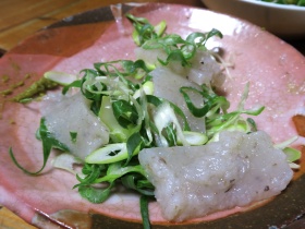 | 12:00 観光物産館があったので立ち寄ります。名産品の ひもかわうどんと刺身こんにゃく買いました。 刺身こんにゃくは上品で想像以上に美味しかった です。 |