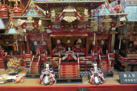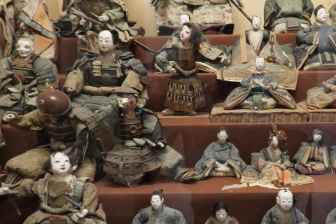| 再び人形のコーナー。 とても古い日本人形が並びます。なかには江戸 時代のものもあります。 ここから先は作品保護のために照明を落としてい るらしく、そのため画像も不鮮明になっていますが、 そこはご容赦を。 |