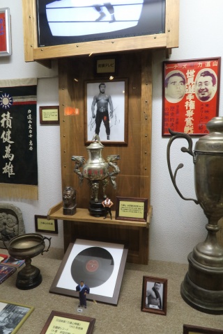 | なぜか唐突にプロレスのコーナー。 力道山をはじめとするヒーロー達のカップやチャンピ オンベルトなんかが並びます。 これってけっこうすごいコレクションなのではないでし ょうか。 |