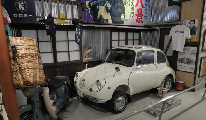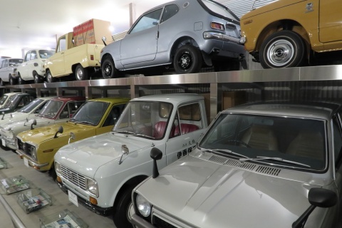 | ここから先は自動車の展示スペース。 まずは大衆車のコーナーから、昔懐かしい昭和の クラシックカーが何十台と並びます。 |