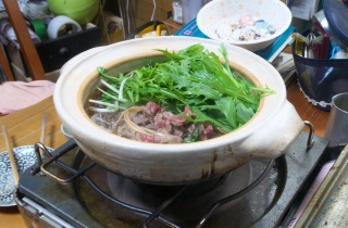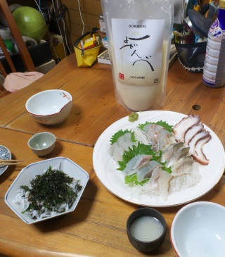 葉山牛の鍋、しらす、お刺身・・・、奥にあるのが会津若松のどぶろく「よがんべ」。
