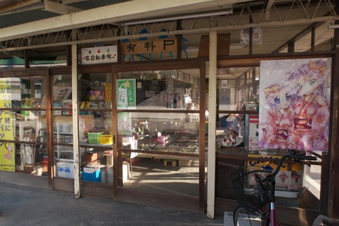 ちょっと違うとすれば、駅のすぐ前にあるお店(駄菓子屋さん?)にいろんなアニメのポスターが