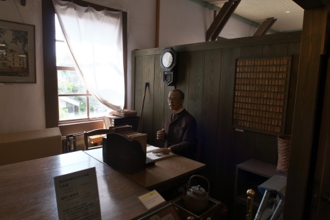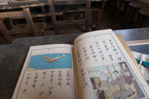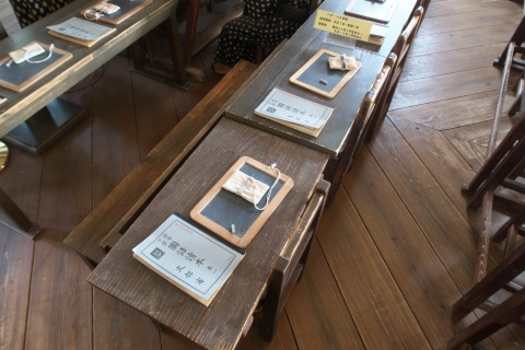1Fの入ってすぐの部屋では当時の授業風景が再現されていました。小さな机の上には教科書と石墨。