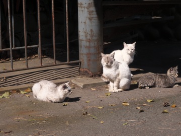 その森の中にある諸口神社ではネコが集まってひなたぼっこしてました。君たち暇なんだね。