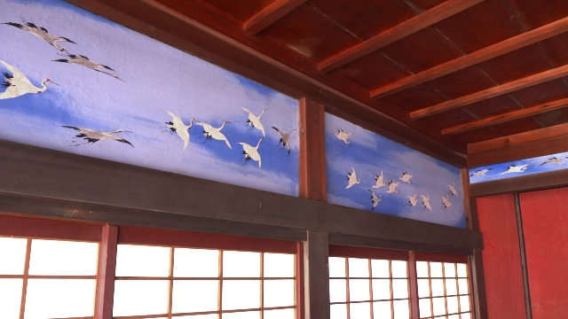 二階の講堂には入江長八作の千羽鶴が刻まれています。鏝でこんなに繊細な絵がよく描けるな・・・。