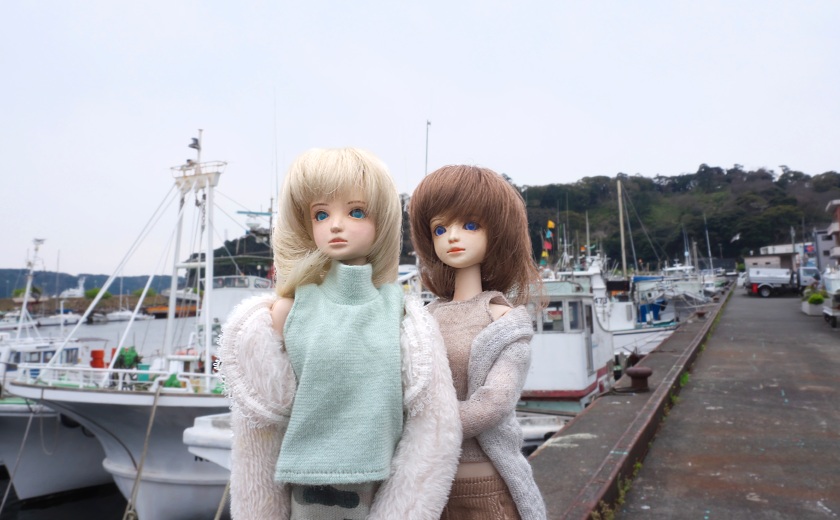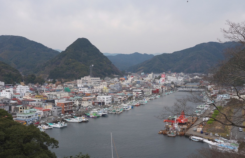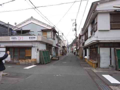 市街地の散策を開始です。まずは漁港、そしてひもの通り。