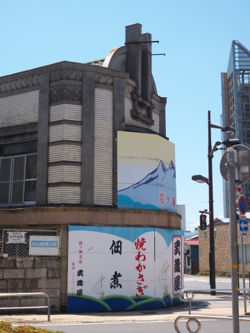 角地に立てられた見事な看板建築は佃煮の武蔵屋さん。