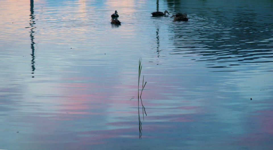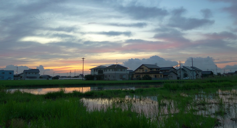 水のたまった休耕田の風景。昼間に見れば別にどうってことのない風景ですが、この時間帯に見ると