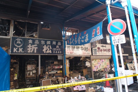 先日ニュースになっていた場外市場の火災現場ですが、まだ片づけも終わっていない状況