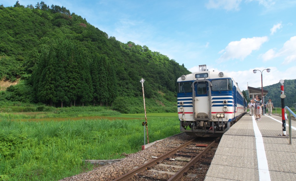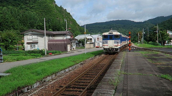 只見 2017.08.26 かねてより計画していた只見線沿線の旅に行ってきました。 只見線は新潟県の小出と福島県の会津若松を結ぶJRの路線で営業距離135.2km。(現在、災害の影響で一部区間が不通) 谷間を走る絶景の路線として有名で、ローカル線の人気投票をすると常に上位にくるとか。そういうわけでぜひ乗ってみたいと 思っていました。 08.26(土) 7:05 入広瀬8:33発の列車に乗るつもりで家を4:30に出ました。今回の旅は1日3往復半の只見線を中心に旅の計画を立てています。 ただお天気はご覧のとおり、関越道は7:00時点で土砂降りです。 ![]() 天気予報では前線の通過する朝までは激しい雨、でもその後は一気に回復して晴れるということです。 それを信じて車を走らせます。 8:00 関越道を降りる頃、嘘みたいに雨はあがってきました。天気予報えらい! 本日最初の目的地、JR只見線の入広瀬駅です。 ![]() ![]() こちらは無人駅なのですが、ホームの待合室以外にも「雪国観光会館」という休憩施設?があって、誰でも利用できます。 中にはかつてここが入広瀬村だった頃の資料が展示されていたりします。 ![]() 列車の到着まで30分ほどあるので、ちょこっと散歩してみることにしました。 このあたりは生活道路である国道252号線が、11月下旬からほぼ半年間にわたっても通行止めになってしまうというほどの 豪雪地帯です。(以前ゴールデンウイークにやってきて、えー! 本当にまだ通れないの?だった。) でも駅周辺はタイムスリップしてしまったかのような雪国らしい建物もあって、やってこられるなら冬の方が素敵な景色なんだ ろうなと思いました。 ![]() ![]() 破間川にかかるこの赤い橋が何ともフォトジェニック。ちょうど天気も回復してきて、そのシルエットが美しいです。 ![]() ![]() この橋の周辺にJAや商店街などがあって、きっとこのあたりが旧入広瀬村の中心街だったんだろうと思います。 とりあえず時間になったので、いったんここを離れ、列車で只見駅に向かいことにします。 8:32 只見行の列車が到着です。 このシーンは下の画像をクリックすると動画でご覧いただけます。▼(但しデータ量が大きいのでご注意下さい) ![]() 末沢川に沿って谷間をすすみます。もちろん景色は山と川、そしてときどき田んぼと民家、長ーいトンネルといった感じです。 大雨の降ったあとなので流れるのは大量の濁流、いつもはもっときれいなんだろうね。 ![]() ![]()
