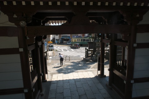ここも江ノ電の撮影スポット。山門から江ノ電が見えた瞬間をパチリと撮影させていただきました。