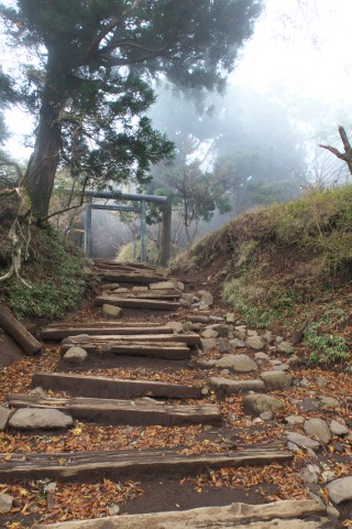 きつい上りもそろそろ終わり、いよいよ山頂というところで、いちめん雲に覆われてきました。山ではよくあることなんだけど、ちょっと残念。