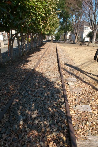 その先の線路の通っていた部分は緑道として整備されています。けっこう密集した住宅地のなかを通っていたんだね。ところどころに車輪