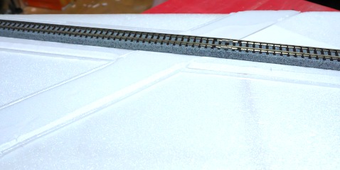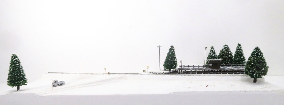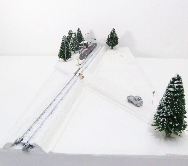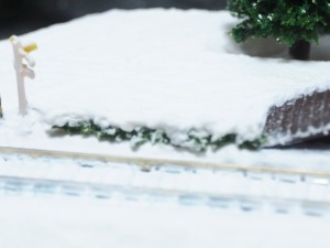 | 32 線路脇には植え込みを追加。フォーリッジを適宜 切り出し、上に雪を載せています。 |