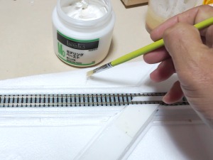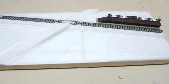 | 8 段差が残っているので、0.5mm厚のプラ板を切り、 スムースにつながるよう道路部分に接着します。 |