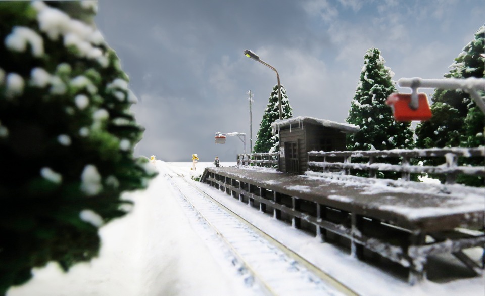 22 最後にテクスチュアペイントで粉雪の表現を、 ホームや手すりに加えます。 |