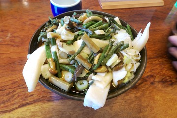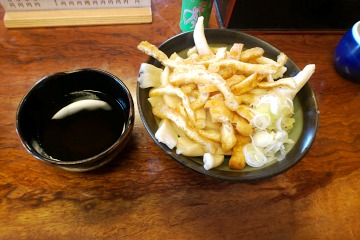 左側は山菜うどん、右は揚げのたくさんのったもりうどんです。(700円と550円) ボリュームもさることながら、うどんの太さが3cm×1cm